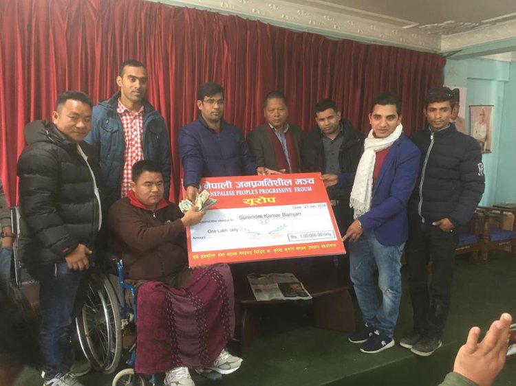 मेरुदण्ड पीडित बम्जनलार्इ जनप्रगतिशिल मञ्च युराेपको १ लाख ५ हजार सहयोग