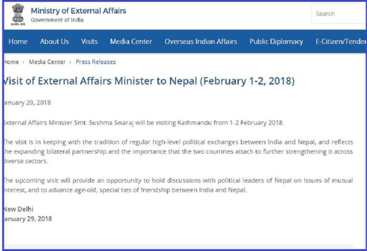 \"\"काठमाडौं । भारतीय विदेशमन्त्री सुस्मा स्वराजले आगामी फेब्रुअरी १ र २ तारिख (माघ १८ र १९ गते) मा नेपालको भ्रमण गर्ने भएकी छन् । नेपालमा वाम गठबन्धनले सरकार बनाउन लागेको पूर्वसन्ध्यामा स्वराजको नेपाल भ्रमणलार्इ अर्थपूर्णरुपमा लिइएको छ । अाजको अन्नपूर्णमा खबर छ-नेकपा एमाले र नेकपा माओवादी केन्द्रबीच पार्टी एकता र सरकार निर्माणको प्रयास अन्तिम चरणमा पुगिरहेका बेला विदेशमन्त्री स्वराज छिमेकीसँगको सम्बन्ध अझ मजबुत बनाउन नेपाल भ्रमणमा निस्कन लागेको जानकारी भारतीय विदेश मन्त्रालयले सोमबार जानकारी दिएको छ । यो भ्रमणलाई भारतीय पक्षले भारत र नेपालबीच नियमित उच्चस्तरीय राजनीतिक आदानप्रदानको संज्ञा दिएको छ । \'यो भ्रमण भारत र नेपालबीच नियमित उच्चस्तरीय राजनीतिक आदान-प्रदानको परम्परालाई ध्यानमा राख्दै हुन लागेको छ\', भारतीय विदेशमन्त्रालयले विज्ञप्तीमार्फत भनेको छ, \'त्यसैगरी द्विपक्षीय साझेदारी र दुवै देशबीचको सम्बन्धलाई विभिन्न क्षेत्रमा अझ मजबुत बनाउन यो भ्रमण महत्वको दर्शाउँछ ।\' भारतीय विदेश मन्त्रालयले स्वराजको आगामी यात्रा नेपालका क्रममा राजनीतिक नेतासँग परस्पर हितका मुद्दामा वार्ता र विचार विमर्शको अवसर पनि मिल्ने अपेक्षा गरेको छ । \'यो भ्रमणले नेपाली राजनीतिक नेतृत्वसँग विचार विमर्श गर्ने अवसर दिनेछ\', भारतीय विदेश मन्त्रालयले भनेको छ, \'भारत र नेपालबीच रहेको पुस्तौँदेखिको मित्रता र विशेष सम्बन्धलाई अझ बलियो बनाउन यो भ्रमणले अवसर प्रदान गर्नेछ ।\' \"\"