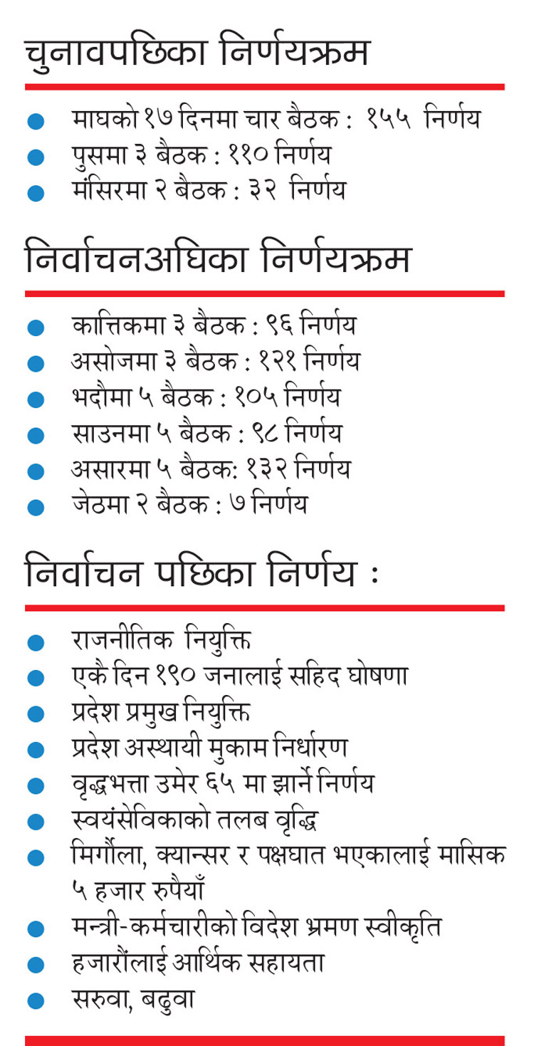 \"\"काठमाडौं । शेरबहादुर देउवा नेतृत्वको कामचलाउ सरकारले चुनाव सम्पन्न भएपछिको दुई महिना अवधिमा मात्रै ३ सयभन्दा बढी निर्णय गरेको छ। सरकारले २१ मंसिरदेखि १७ माघसम्मको अवधिमा मात्रै झन्डै ३ सय निर्णय गरेको हो । सामान्यतय निर्वाचनलगत्तै सरकार कामचलाउ हुने तथा यस्तो सरकारले अत्यावश्यक र नियमित प्रशासनिक काम मात्रै गर्नुपर्ने मान्यतालाई बेवास्ता गर्दै देउवा नेतृत्वको सरकारले पछिल्लो दुईमहिने अवधिमा मात्रै ३ सय निर्णय गरेको छ । अाजको अन्नपूर्णमा खबर छ-यो अवधिमा सरकरले वृद्धभत्ता उमेर अवधि ७० बाट ६५ मा झार्ने, भूकम्पपीडितलाई १ लाख रुपैयाँ थप गर्ने, किड्नी, क्यान्सर र पक्षघातका बिरामीलाई मासिक ५ हजार भत्ता दिने निर्णय गरेको छ। देउवा नेतृत्वको सरकारले निर्वाचन अघिको ६ महिनामा ५ सय ५९ वटा निर्णय गरेको थियो। सरकारले हचुवाको भरमा निर्णय गरे पनि त्यसलाई कार्यान्वयनमा ल्याउन सकस भएपछि झन्डै दर्जन निर्णय अलपत्रजस्तै भएको प्रधानमन्त्री कार्यालय स्रोतले जानकारी दिएको छ। २३ जेठमा प्रधानमन्त्री नियुक्त भएका देउवाले २४ जेठमा पदभार ग्रहण गरेका थिए। देउवाले आठ महिनाको अवधिमा सात पटकसम्म मन्त्रिपरिषद् गठन र विघटन गर्दै इतिहासकै जम्बो ६५ सदस्यीय मन्त्रिपरिषद् बनाए। \"\" उनकै कार्यकालमा स्थानीय तह, संघ र प्रदेशसभा निर्वाचन भने सफलतापूर्वक सम्पन्न भएको छ। चुनावपछि लोकतान्त्रिक पद्धतिअनुसार व्यवहार देखाउन नसकेको र धमाधम दर्जनौं निर्णय गराएर मुलुकलाई आर्थिक व्ययभार पार्ने र नकारात्मक असर पर्ने दूरगामी निर्णय गरेको भन्दै देउवाको आलोचना हुँदै आएको छ। देउवाले अहिले पनि विभिन्न निकायमा नियुक्ति दिने क्रमलाई निरन्तरता दिँदै आएका छन्। प्रधानमन्त्री कार्यालयका अनुसार माघ महिनाको तीन साताको अवधिमा मात्रै देउवा नेतृत्वको सरकारले झन्डै १ सय ५० वटा निर्णय गरेको छ। अझै दर्जनौं प्रस्ताव मन्त्रिपरिषद्मा दर्ता भइसकेका छन्। कतिपय राजनीतिक नियुक्तिमा मन्त्रीहरूले आर्थिक चलखेल गरेको दाबी उच्च प्रशासकको छ। प्रधानमन्त्री कार्यालयका अनुसार पुसमा मात्रै झन्डै १ सय १० वटा निर्णय भएका थिए भने मंसिरमा ३२ वटा निर्णय भएका छन्। पछिल्लो समयमा मन्त्रीहरूको ठाडो प्रस्तावमा निर्णय हुने क्रम ह्वात्तै बढेको छ। सरकारका प्रवक्ता एवं सञ्चारमन्त्री मोहनबहादुर बस्नेतले संघीय संसद् र प्रदेश निर्वाचन सफलतापूर्वक गराएको सरकारले अर्को सरकार नआउँदासम्म सबै निर्णय गर्न सक्ने जिकिर गरे। ‘सफलतापूर्वक निर्वाचन गराएको सरकारले बिदा नलिँदासम्म आवश्यकताअनुसार निर्णय गरिरहेको छ’, मन्त्री बस्नेतले भने। महिला बालबालिका तथा समाजकल्याणमन्त्री विक्रमबहादुर थापा पनि सरकारले 