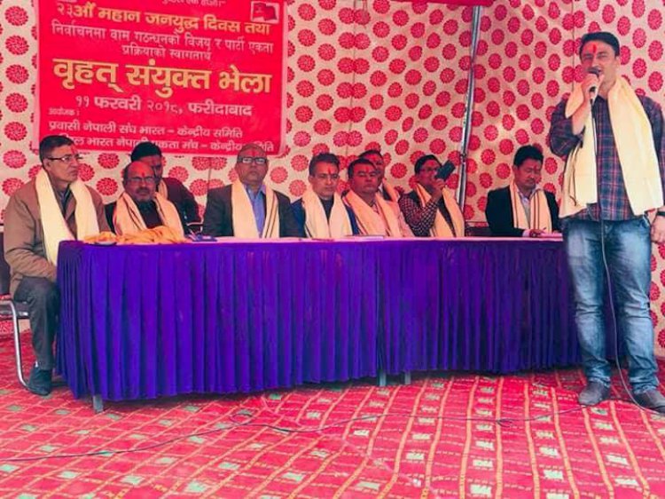 \"\"भारत । नेकपा माओवादी केन्द्र निकट अखिल भारत नेपाली एकता मञ्च र नेकपा एमाले निकट प्रबासी नेपाली संघ भारतको संयुक्त आयोजनामा आइतबार भारतको फरिदाबादस्थित कार्यालयमा एक कार्यक्रमको आयोजना गरि २३ औं जनयुद्ध दिवस सयुक्त रूपमा सम्पन्न गरिएको छ । \'वामपन्थी तालमेल र पार्टी एकता राष्ट्रको ऐतिहासिक आवश्यकता, सवल र समृद्ध राष्ट्र निर्माण गर्ने संकल्पसहित\' वाम गठबन्धनको प्रदेशसभा र प्रतिनिधिसभाको जीतलाई स्वागत गर्दै प्रवासी नेपाली संघ भारत र अखिल भारत नेपाली एकता मंचको समुक्त आयोजनामा जनयुद्ध दिवस मनाइएको हो । कार्यक्रममा अखिल भारत नेपाली एकता मंचका केन्द्रीय अध्यक्ष इशरी भण्डारीको अध्यक्षता रहेको थियो भने प्रवासी नेपाली संघ भारतकी केन्द्रीय उपाध्यक्ष सीता अधिकारीद्वारा कार्यक्रम संन्चालन गरिएको हो । कार्यक्रम ज्ञात आज्ञात सहिदहरुको सम्झनामा मौन धारण गर्दै अखिल भारत नेपाली एकता मंचका केन्द्रीय सचिव आरबी खड़काको स्वागत मन्तव्यबाट सुरु भएको थियो । नेकपा माओवादी केन्द्रका केन्द्रीय सचिवालय सदस्य लक्षमण पन्तको प्रमुख आतिथ्यता रहेको कार्यक्रममा अथितिका रूपमा प्रवासी नेपाली संघ भारतका केन्द्रीय अध्यक्ष लोकनाथ भण्डारी , अखिल भारत नेपाली एकता मंचकि केन्द्रीय सचिब उषा थापा खड़कालगायतको उपस्थिति रहेका थियो । कार्यक्रममा आफ्नो मन्तव्य राख्दै मन्चकि केन्द्रीय सचिव खड्काले वाम एकता राष्ट्रको युगान्तकारी परिवर्तनका लागि अहिलेको आवस्यकता रहेको बताउँदै नेपाली जनताले विगत ७० वर्षदेखि अनेकौं शान्तिपूर्ण जनआन्दोलन र सशस्त्र संघर्षहरू सञ्चालन गर्दै यहाँसम्म आएको र यी संघर्षका क्रममा हजारौं योद्धाहरूले आफ्नो जीवन बलिदान गरेको , हजारौं योद्धा बेपत्ता भएको , हजारौं घाइते र अंगभंग भएको भन्दै परिवर्तनको लडाइँ र त्यसमा बलिदान दिने महान सहिद हरुलाइ कहिलै बिर्सेन नसक्ने बताएकि छिन । नेपालमा सयौ वर्षदेखि चल्दै आएको एकात्मक राजतन्त्रात्मक व्यवस्थाको अन्त्य गरि मुलुकमा संघीय लोकतान्त्रिक गणतन्त्र स्थापना र जनताको आफ्नै संविधान समेत निर्माण गरिसकेको अबस्थामा प्राप्त उपलब्धि लाई रक्षा गर्दै देशलाई बिकासको गतिमा अगाडि लैजान सबै बामपंथी एक भएर लाग्नुपर्ने उनको भनाइ थियोे । उक्त कार्यक्रममा उपस्थित ज्ञान बहादुर केसी , किशन बोहरा मानु क्षेष्ठ अर्जुन दयाल , सूर्य राना प्रवासी नेपाली संघ भारत केंद्रीय सचिवालय सदस्य राम बहादुर डीसी मोहन थापा महिला नेतृ इशरी भण्डारी प्रवासी नेपाली संघ भारत राज्य नेता हेमंत अधिकारीलगायत सबैले बामपंथी एकताको विकल्प नरहेको भन्दै नेतृत्वले जनताको म्यान्डेटलाइ बिर्सन नमिल्ने धारणा राखेका थिए भने एमालेले पनि जनयु