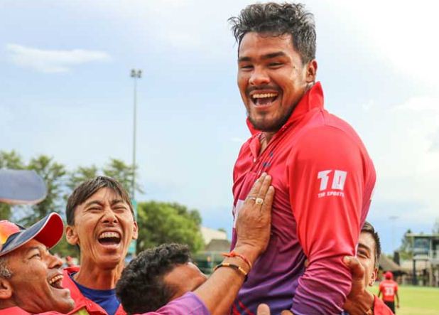 \"\"काठमाडौं । आईसीसी वर्ल्ड क्रिकेट लिग डिभिजन टुमा क्यानडालाई एक विकेटले हराउँदै सनसनीपूर्ण जितको प्रशंसा छ । अन्तिम ओभरमा ८ रन चाहिएको बेला क्रिजमा रहेका करण केसीले नेपाललाई छक्का प्रहार गर्दै सहजै विजयको यात्रामा डोहोर्‍याए । त्यसैले यो जितको नायक करण बने । क्यानडाविरुद्धको खेलमा नेपालले एक विकेटको सनसनीपूर्ण जित निकाल्दै विश्वकप छनोटमा स्थान बनाएपछि नेपाली खेलाडीहरुले मैदानभित्र मात्रै खुसीयाली साटेनन्, ड्रेसिङ रुमभित्र पनि विजय उत्सव मनाए ।