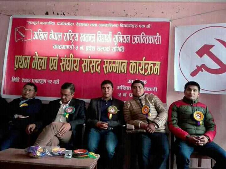 \"\"काठमाडौ । अखिल क्रान्तिकारी काठमाडौं ५ नम्बर प्रदेश सम्पर्क समितिको भेला तथा संघीय सांसद सम्मान कार्यक्रम विश्वभाषा क्याम्पसमा सम्पन्न भएको छ । अखिल क्रान्तिकारी केन्द्रीय सचिव नारायण खनालको अध्यक्षतामा सञ्चालन भएको कार्यक्रममा अर्घाखाँचीबाट प्रतिनिधिसभा सदस्यमा निर्वाचित सांसद टोपबहादुर रायमाझीको प्रमुख अातिथ्यता रहेको थियो भने अतिथिहरुमा सांसद कमला रोका अखिल क्रान्तिकारी उपाध्यक्ष दिपक देवकोटा, पन्चा सिह, दिपेश पुन अखिल क्रान्तिकारी सचिव नरेश रेग्मी, गंगा दाहाललगायत रहेका थिए । उक्त कार्यक्रमले मिनराज वलिको सँयोजकत्वमा ४१ सदस्य समिति निर्माण गर्दै सम्पन्न भएको छ ।