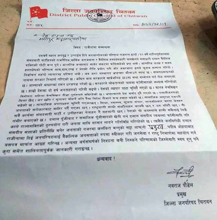 \"\"काठमाडाैं । नेत्र विक्रम चन्द विप्लव नेतृत्वको नेपाल कम्युनिस्ट पार्टी निकट जिल्ला जनपरिषद (जनसत्ता) चितवनले भरतपुर महानगरपालिकाकी मेयर रेणु दाहाललाई पत्रमार्फत राजीनामा माग गरेकाे छ । शुक्रबार जिल्ला जनपरिषद चितवनका प्रमुख नवराज पौडेलले हस्तक्षर गरेको पत्र चितवनको भरतपुर महानगरपालिकाकी मेयर दाहाललाई सम्बोधन गरेर राजीना दिन पत्रमार्फत् चेतावनी दिएका हुन् । पत्रमा सरकारले लोकतन्त्रको नाममा फासिवाद अभ्यास, आस्थाको भरमा गिरफ्तारी, गरिबी, व्यापार घाटा, मानव बेचबिखन, भ्रष्टाचार, कर छलीे, महिला बेचबिखन, महिला हिंसा, समामाजिक दलालीकरणहरुको तीव्र बढिरहेकोप्रति असन्तुस्ट जनाउदै राजीनामा दिई वैकल्पिक सत्ताको रुपमा स्वीकार गरी जनसेवा र राष्ट्र निर्वाणमा सहयोग गर्न आग्रह समेत गरेका छन् । \"\"