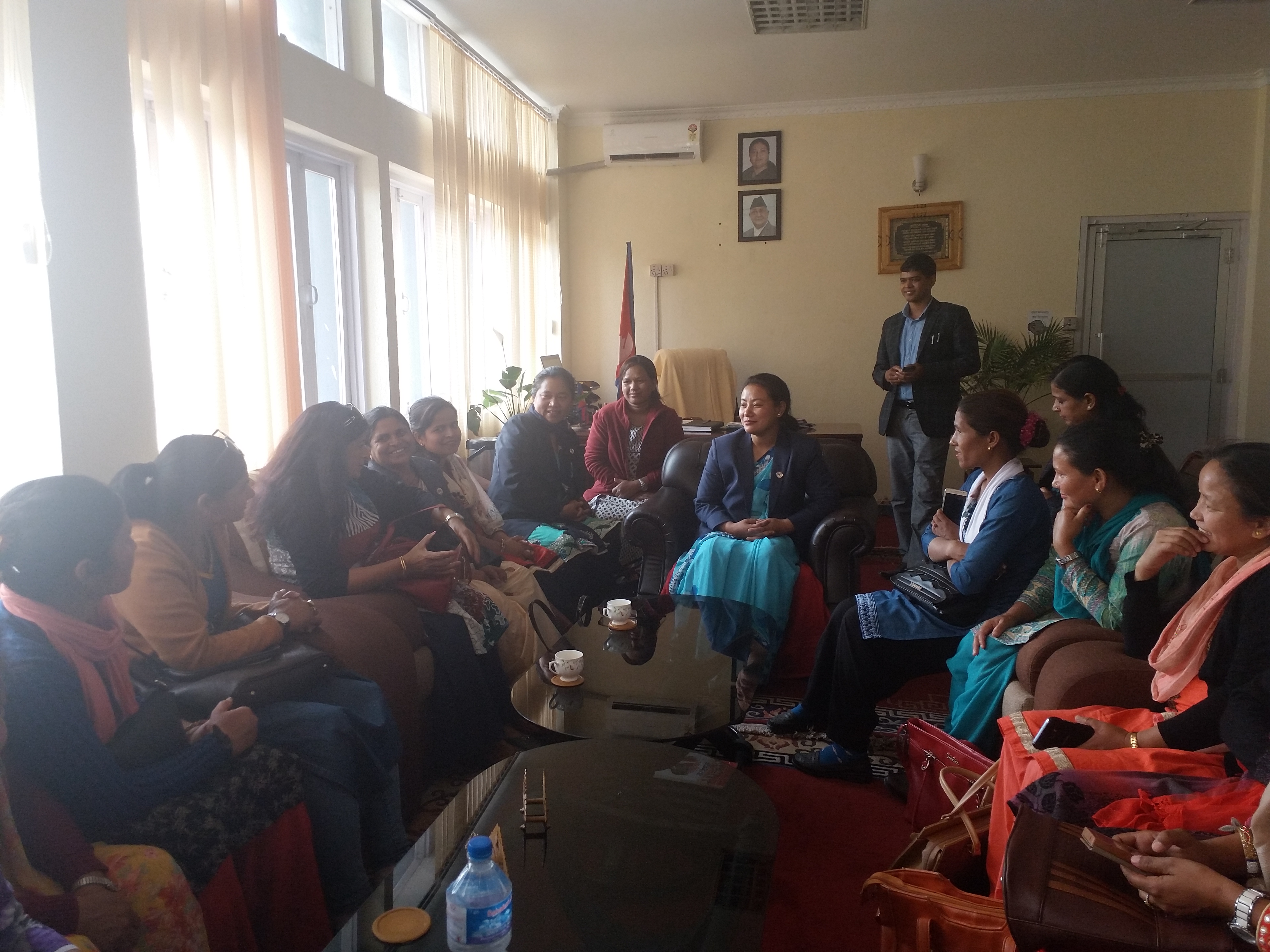 \"\"काठमाडौ। अखिल नेपाल महिला संघ (क्रान्तिकारी) केन्द्रीय कमिटीको टोलीले खानेपानी मन्त्री बिना मगरलाई बधाई तथा शुभकामना दिएको छ । महिला संघ क्रान्तिकारीमा लामो समय सक्रिय रहेकी बिना मगर मन्त्री भएपछि खुसी व्यक्त गर्दै टोलीले मन्त्रालयलै पुगेर बधाई दिएको हो । खानेपानी मन्त्री बिना मगरप्रति संगठनका सदस्यको ठूलो अपेक्षा रहेको संघका अध्यक्ष अमृता थापाले बताइन । टोलीमा देशैभरिका महिला नेतृको सहभागिता रहेको थियो । बधाई ग्रहण गरेपछि टोलीलाई सम्बोधन गर्दै मन्त्री बिना मगरले खानेपानी मन्त्रालय दिदीबहिनीसँग प्रत्यक्ष जोडिएको बताइन् । खानेपानी मन्त्रालयलाई सामान्य रुपले हेरेर बजेट लगायतमा कम महत्व दिने गरिएकाले जनताको मौलिक हकसँग जोडिएको मन्त्रालयलाई स्थापित गर्नुपरिरहेको मन्त्री मगरले बताइन ।