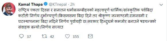 \"\"काठमाडाैं । सरकारले कटौती गरेको सार्वजनिक विदाको विषयमा नयाँ शक्ति नेपालका संयोजक डा. बाबुराम भट्टराई र राष्ट्रिय प्रजातन्त्र पार्टीका अध्यक्ष कमल थापाले मिश्रित प्रतिक्रिया दिएका छन् । सरकारले १ सय ६२ वटा भन्दा बढी दिन विदा हुने गरेको भन्दै बुधबारको मन्त्रिपरिषद बैठकले २२ दिन बिदा कटौती गरेको हो । भट्टराईले ट्वीट लेख्दै अब रातो पासपोर्ट बाहकको संख्या घटाउन, भीआइपीहरुका लागि सुरक्षाकर्मी कम गरी गुणस्तरीय बनाउन सुझाव दिएका छन् । \"\" उनले भनेका छन्, ‘विदा कटौती गर्ने सरकारको निर्णय सकारात्मक छ ! अब रातो पासपोर्टधारीको संख्या बढाउनुसट्टा घटाउने: VIP लाई सुरक्षाकर्मी कम (बरू गुणस्तरीय) गर्ने र अनावस्यक ब्यक्तिका लागि पूर्ण अन्त्य गर्ने: कथित ठुलाबडाको विदेश आवतजावतमा विदा दिनै प्रथा र सडकमा जनतालाई सास्ती दिने कुरा रोक्ने होस् है !’ त्यस्तै अध्यक्ष थापाले पनि सरकारले कटौती गरेको सार्वजनिक विदाको विषयमा आपत्ती जनाएका छन् । राष्ट्रिय एकता दिवस, राम नवमी, घटस्थापना लगायतका दिनको विदा कटौती गरेर सरकार हिन्दु धर्म कमजोर बनाउने संवाहक बनेको आरोप लगाएका छन् । \"\" उनले भनेका छन्, ‘ राष्ट्रिय एकता दिवस र सनातन धर्माबलम्बीहरुको महत्वपूर्ण धार्मिकरसांस्कृतिक पर्वबिदा कटौती निर्णय दुर्भाग्यपूर्ण । क्रिसमसमा बिदा दिने तर श्रीकृष्ण जन्माष्टमी,रामनवमी र घटस्थापनामा बिदा नदिने निर्णय पुर्वाग्रही छ । सरकार हिन्दुधर्म कमजोर बनाउने षडयन्त्रको संवाहक बन्यो । निर्णय सच्याउ’