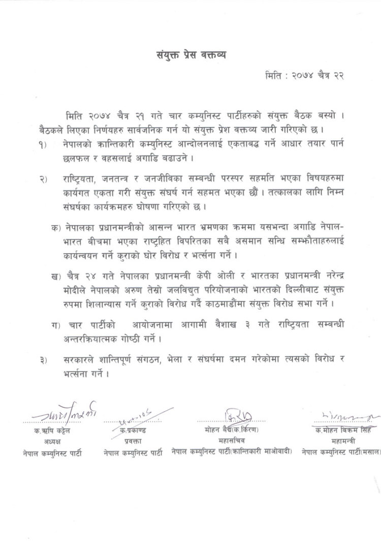 \"\"काठमाडाैं । चार कम्युनिष्ट पार्टीले आन्दोलनका कार्यक्रम घोषणा गरेका छन् । नेत्रविक्रम चन्द ‘विप्लव’, मोहन बैद्य, ऋषिराम कट्टेल र मोहन विक्रमसिंह नेतृत्वका चार कम्युनिष्ट पार्टीले आन्दोलनका कार्यक्रम घोषणा गरेका हुन् । चारै जना नेताहरुले संयुक्त विज्ञप्ति जारी गर्दै अान्दोलनका कार्यम्रक सार्वजनिक गरेका हुन् । प्रधानमन्त्री केपी ओलीको भारत भ्रमणका क्रममा यसअघि नेपाल भारतबीच भएका असमान सन्धी सम्झौताको कार्यन्वयन गर्ने सरकारको तयारीको विरोध गर्ने, चैत २४ गते दुवै देशका प्रधानमन्त्रीले अरुण तेस्रो परियोजनाको दिल्लीबाट संयुक्र रुपमा उद्घाटन गर्ने निर्णयको विरोधमा सोही दिन काठमाडौमा विरोध प्रदर्शन गर्ने बताएका छन् । त्यस्तै उनीहरूले बैशाख ३ गते चारवटै पार्टीले अन्तरक्रिया गर्ने निर्णय गरेको बताएका छन् । भूमिगत रहेका विप्लवलार्इ पक्राउ गर्न प्रहरीले यसअघि नै निर्देशन दिएको छ । \"\"