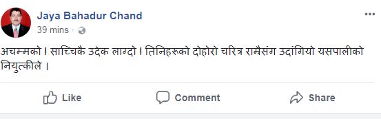 जयबहादुर चन्दले अाइजिपी नियुक्तिबारे यस्तो लेखे स्ट्याटस