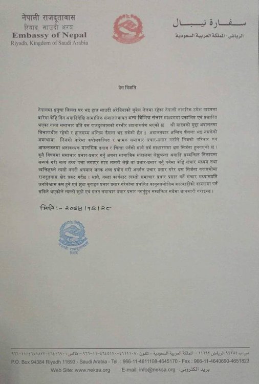 साउदी जेलमा रहेका यादवबारे लेखिएको समाचारको दूतावासले गर्यो खण्डन
