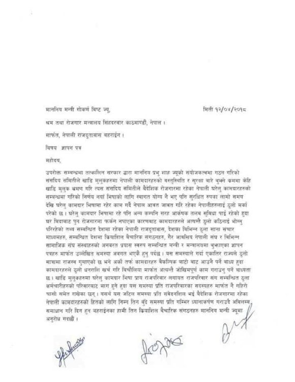 \"\"बहराइन । बहराइनमा रहेका काङ्ग्रेस ,एमाले र माओवादी केन्द्रका संगठनहरुले श्रम मन्त्री गोकर्ण बिस्ट लाई घरेलु कामदार ,श्रम स्वीकृत तथा भिसा प्रक्रिया बारे ध्यानाकर्षण गराउदै सयुक्त रूपमा ज्ञापन पत्र बुझाएका छन। गत बिहिवार नेपाली दुतावास बहाराईनका राजदुत पदम शुन्दास मार्फत ३ बुदे ज्ञापन पत्र बुझाउदै आफुहरुले उठाएको विषय गम्भीर रहेको र यसबारे तत्काल समस्या समाधानको लागि पहल गर्न राजदुत मार्फत अपिल समेत गरिएको जानकारी नेपाली जन प्रगतिशील मंच बहराइनले खबर डबलीलाई दिएको छ । ज्ञापन पत्रमा घरेलु कामदारका रूपमा बहराइनमा कार्यरत कामदारलाई छुट्टिमा नेपाल गएर फर्कन समेत सरकारले प्रतिबन्ध लगाउदा आकर्षक रोजगारी गुमेको र धेरै कामदार बेरोजगार भएको भन्दै सरकारले यस्ता नियम तत्काल खारेज गरि वैदेशिक रोजगारी लाई सुरक्षित र ब्यबस्थित बनाउदै घरेलु कामदारको प्रक्रिया तत्काल खुल्ला गर्नुपर्ने माग गरिएको छ । यस्तै अघिल्लो सरकारले विभिन्न देशमा कामगर्दै आएका कामदारले सम्बन्धित देशको दूतावास मार्फत नै श्रम स्वीकृत लिन सक्ने निर्णय गरेको भए पनि हाल सम्म सो निर्णय कार्यनयन हुन नसक्दा धेरै दुख भोग्नु परेको भन्दै उक्त निर्णयलाई कार्यनयन गराउन समेत माग गरिएको छ । नेकपा एमाले निकट प्रवासी नेपाली मंन्च नेपाली काङ्ग्रेस निकट जनसम्पर्क समिति तथा माओवादी केन्द्र निकट नेपाली जनप्रगतिशिल मंन्च का केन्द्रिय प्रतिनिधिहरुको उपस्थितिमा बुझाइएको ज्ञापन पत्रमा नयाँ भिसा लिदा सम्बन्धित देशको चेम्बर अफ कमर्सको प्रमाणीकरण पश्चात् मात्रै दूतावासले प्रमाणीकरण गरि पठाउने नियम निक्कै झन्झटिलो रहेको भन्दै यस्तो नियम लाई तत्काल हटाइ सिधै दूतावास बाट भिसा प्रमाणीकरणको ब्यबस्था मिलाउन समेत माग गरिएको मंच बहराइनले जानकारी दिएको छ ।\"\"