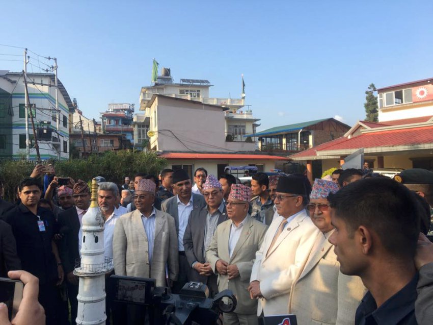 काठमाडौं । नेपाल कम्युनिष्ट पार्टीका नेताहरुले पहिला धुम्बाराहिमा रहेको नेकपाको कार्यालय अवलोकन गरेका छन् । प्रधानमन्त्री तथा नेकपाका अध्यक्ष केपी शर्मा ओली, अधयक्ष तथा पूर्वप्रधानमन्त्री पुष्पकमल दाहाल प्रचण्डलगायत मन्त्री तथा नेताहरुले अवलोकन गरेका हुन् । \"\" \"\" \"\" \"\" \"\" \"\"