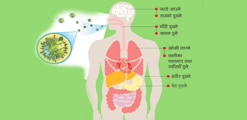 त्यस्तै शरीर दुख्ने, छाती घ्यारघ्यार हुने, स्वाँस्वाँ हुने र बान्ता समेत हुन सक्छ । कसै–कसैलाई पेट दुख्ने एवं पखाला लाग्ने लगायत लक्षण देखिन सक्छन् ।