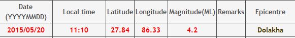काठमाडौं, भूकम्पको अर्को धक्का महसुस गरिएको छ । राष्ट्रिय भूकम्प मापन केन्द्रले बुधबार बिहान ११ः१० मा दोलखा केन्द्रबिन्दु रहेको ४.२ म्याग्निच्युडको भूकम्प मापन गरेको छ । भूकम्पको धक्का क्रमशः कम हुँदै गएको छ । बुधबारको लागि यो पहिलो धक्का हो ।