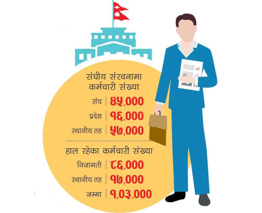 संघः ४५ हजार प्रदेशः १६ हजार स्थानीयः ५७ हजारसमितिले झण्डै चार महिना लगाएर तिनै तहमा रहने सरकारी कार्यालय र कर्मचारी दरबन्दीको प्रारूपसहितको प्रतिवेदन तयार पारेको हो । संघ, प्रदेश र स्थानीय तहको संगठन संरचना र कर्मचारी दरबन्दीको टुंगो लाग्न नसक्दा कर्मचारी समायोजन प्रक्रिया नै अवरुद्ध हुँदै आएको छ । संघीय मामिला तथा सामान्य प्रशासन मन्त्रालयका प्रवक्ता अधिकारीले संघ, प्रदेश र स्थानीय तहमा रहने सरकारी कार्यालयको टुंगोसहितको कर्मचारीको नयाँ प्रस्तावित दरबन्दी समेत तयार भएकाले अब कर्मचारी समायोजन प्रक्रिया थाल्न सहज हुने बताए । ओएन्डएम समितिको प्रतिवेदनका आधारमा नै संघ, प्रदेश र स्थानीय तहमा आवश्यक कार्यालय र कर्मचारी रहने प्रवक्ता अधिकारीले वताए । हाल संक्रमणकालीन व्यवस्थाअनुसार संघ, प्रदेश र स्थानीय तहमा कार्यालयहरू र कर्मचारी छन् । समिति प्रतिवेदनका आधारमा प्रशासनिक पुनर्संरचनाको काम हुने समितिकी सदस्य–सचिव नीता पोखरेलले जानकारी दिइन् । हाल रहेका ८६ हजार निजामती कर्मचारी सबैलाई पुल दरबन्दीमा राखिएको छ । अब संघ, प्रदेश र स्थानीय तहमा तिनै ८६ हजार कर्मचारीलाई समायोजन गरिने छ । संघ, प्रदेश र स्थानीय तहमा रहने सरकारी कार्यालय र कर्मचारीको अन्तिम टुंगो लाग्न नसक्दा कर्मचारी समायोजन हुन सकेको थिएन, जसका कारण कर्मचारीहरू स्थानीय तहमा जान मानिरहेका थिएनन् । अब भने समायोजन ऐनअनुसार नै कर्मचारी समायोजन प्रक्रिया थालिने भएकाले कर्मचारीहरू स्वतः खटिएको स्थानमा जानै पर्ने र नगए कानुनी कारबाहीको भागीदार बन्नुपर्ने मन्त्रालयका प्रवक्ता अधिकारीले बताए । हाल निजामती कर्मचारी: ८६ हजार स्थानीय तहका कर्मचारी: १७ हजार जम्मा कर्मचारी: १ लाख ३ हजार अब संघमा रहने कर्मचारी: ४५ हजार कार्यालयहरू: १. प्रधानमन्त्री तथा मन्त्रिपरिषद् कार्यालयसहित २१ मन्त्रालय २. राष्ट्रपति, उपराष्ट्रपति कार्यालय ३. ५७ वटा विभाग तथा केन्द्रीयस्तरका सरकारी निकाय (राष्ट्रिय सर्तकता केन्द्र, नेपाल ट्रस्ट, सार्वजनिक खरिद, राष्ट्रिय योजना आयोग, राष्ट्रिय पुनर्निर्माण प्राधिकरण, ४. १३ वटा संवैधानिक आयोग (लोकसेवा, अख्तियार, निर्वाचन आयोगलगायत) ५. सर्वोच्च अदालत, उच्च अदालत र जिल्ला अदालतहरू ६. महान्यायधिवक्ताको कार्यालय ७. राष्ट्रिय सूचना आयोगलगायत अन्य आयोगहरू ८. मन्त्रालयअन्तर्गतका केन्द्रीय निकायहरू ९. जिल्ला तथा स्थानीय स्तरका कार्यालयहरू (जिल्ला प्रहरी, जिल्ला प्रशासन, इलाका प्रशासन, अध्यागमन कार्यालय, कारागार, हुलाक, सरकारी वकिल कार्यालय, मालपोत, नापी, कोष तथा लेखा नियन्त्रक कार्यालय, भन्सार कार्यालय) प्रदेशमा रहने कर्मचारी: १६ हजार कार्यालयहरू: १. मुख्यमन्त्र
