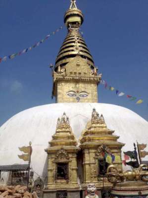 ॐ मणि पद्मे हुम्, ॐ मणि पद्मे हुम्... बुद्धम् शरणम गच्छामी, धम्मम् शरणम गच्छामी संघम् शरणम गच्छामी.... यिनै मन्त्रोच्चारण गरिरहेका थिए अग्लाअग्ला आसनमाथि लस्करै बसिरहेका बुद्धका तीनवटा मूर्तिमुन्तिर मार्बल छापिएको भुइँमा ठूलो टेन्टमुनि लस्करै बसेर बौद्ध धर्मगुरुहरु  । चक्रपथ, बालाजु हुँदै सशस्त्र प्रहरी मुख्यालयभन्दा अलिक पर्तिरबाट स्वयम्भू परिसरको गेट उक्लनासाथ देखिएकाे दृश्य हाे याे । वैशाख १२ र २९ मा गएका ठूला भूकम्पले स्वयम्भू क्षेत्रमा के–कस्तो क्षति पुर्‍यायो भनेर अवलोकन गर्न पंक्तिकार बुधबार बिहान त्यता पुगेको थियो । बौद्ध धर्मावलम्बीहरुको कुनै खास पर्वविना नै नांगो भुइँमै टेन्ट हालेर लामा गुरुहरुले मन्त्र पढिरहेको देख्नासाथ भूकम्पका कारण स्वयम्भू क्षेत्रमा पुगेको प्रकोपको मोटामोटी झल्को दिमागमा नआउने कुरै भएन । निकै अघिदेखि निर्माणकार्य सुरु भई केही वर्षअघि मात्रै ‘फिनिसिङ’ भएका पश्चिमी गेटतर्फका ती बडेमान बुद्धका ३ मूर्तिमध्ये २ वटा ठीकै हालतमा देखिए । छेउकको एउटा मूर्ति भने ढाडपट्टिबाट हल्का चर्किएको देखियो । स्वयम्भू परिसरको त्यो क्षेत्र तुलनात्मक रुपले भूकम्पबाट राम्रैसँग जोगिएछ भन्न सकिन्छ । गेटबाहिर निस्केर सैनिक अस्पताल मोडको उकालो हुँदै स्वयम्भूको मुख्य परिसरतर्फ उक्लँदा भने विश्वसम्पदा सूचीका सीमित स्थलहरुमध्येको एउटा प्रमुख थलो, बौद्धमार्गीहरुको पवित्र तीर्थस्थल तथा सिंगै नेपाल र नेपालीको गौरवगाथा बनेको स्वयम्भूनाथ क्षेत्र करिवकरिव तहसनहस नै भएको देखियो । प्रशस्तै गुम्बा, चैत्य, बिहार, पार्किङ, चमेनागृहलगायतले झकिझकाउ स्वयम्भूनाथभन्दा पछाडिपट्टिको तल्लो रमणीय भाग सुनसान थियो । पानीपोखरीको बीचमा रहेको बालक बुद्धको मूर्ति र पोखरी चाहिँ सकुशल नै थिए । तर, त्यस वरपरका चैत्य भने ठाडै देखिए पनि सबैतिरबाट चर्केका, क्षतविक्षत अवस्थामा । डाँडैडाँडाको सिँढी र स्लेटबाट हिँड्दै पल्लो डिलतिर पुग्दा छेउको चैत्यसहित प्रांगणको आधा भाग चर्केर जुनसुकै बेला जंगलतिर पल्टिहाल्लान् जस्तो अवस्थामा देखिए । भीमढुंगा, रामकोटलगायतका क्षेत्र प्रस्टै देखिने उक्त डिलको माथिल्लो अग्लो डाँडामा रहेका पुराना आश्रम र चैत्यहरुको अवस्था कहालीलाग्दो थियो । नचर्केको, नभत्केको र कुनै न कुनै भाग नढलेको स्थितिमा एउटै थिएनन् । डाँडाबाट फर्कँने बायाँपट्टिको बाटो हिँड्न डरलाग्दो थियो किनकि त्यहाँभन्दा माथिपट्टिका सबै संरचना चर्केर क्षतविक्षत भई बाटोतिरै ढलिहाल्लान् भनेजस्तो गरी ढल्केका थिए । त्यस क्षेत्रको अवलोकनपछि फेरि पोखरीबीचमा रहेको बुद्धको मूर्तिछेउमा फर्केर स्वयम्भूको मुख्य क्षेत्रतर्फ जान खोज्दा दुवैतिरक