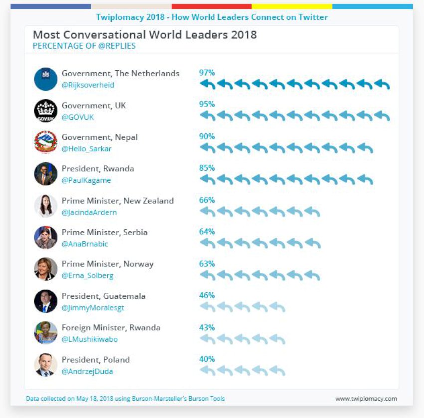 काठमाडाैं । नेपाल सरकार मस्ट कन्भरसेसनल वर्ल्ड लिडर्स २०१८ को तेस्रो स्थानमा पर्न सफल भएको छ । सामाजिक सञ्जाल ट्वीटरमा जवाफ फर्काएको आधारमा नेपाल सरकार ट्वीटर एकाउन्ट @Hello_Sarkar ( हेल्लो सरकार) विश्वमै तेस्रो स्थानमा आएको हो । ट्वीटरमा हेल्लो सरकारलाई मेन्सन गरिएका ट्वीट मध्ये हेल्लो सरकारले ९० प्रतिशतलाई जवाफ दिएको उल्लेख छ । नेपाल भन्दा अगाडि नेदरल्याण्ड सरकारको @Rijksoverheid हेण्डल पहिलो स्थानमा छ । उसले प्रयोगकर्ताले मेन्सन गरेका ९७ प्रतिशत ट्वीटको जवाफ दिएको छ । त्यस्तै दोस्रो स्थानमा रहेको युके सरकारको  @GOVUK ९५ प्रतिशत ट्वीटको जवाफ फर्काएको छ । तेस्रो स्थानमा नेपालसँग चौथो स्थानमा रुवान्डाका राष्ट्रपति @PaulKagame को एकाउन्टबाट ८५ प्रतिशत रिप्लाइ दिइएको उल्लेख छ । न्युजील्याण्डकी प्रधानमन्त्री @JacindaArdern पाँचौँ स्थानमा रहेको छ । यस हेन्डलबाट ६६ प्रतिशत ट्वीटमा रिप्लाइ गएको उल्लेख छ ।