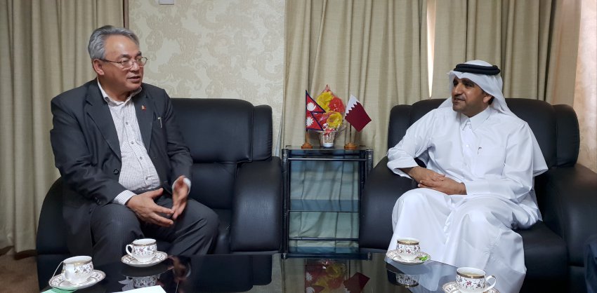 काठमाडौँ। गृहमन्त्री रामबहादुर थापा‘बादल’सँग नेपालका लागि कतारका राजदुत युसुफ बिन मोहम्मदले आज शिष्टाचार भेटवार्ता गरेका छन् । गृहमन्त्रालयमा भएको भेटमा नेपाल–कतार द्धिपक्षीय सम्बन्ध, आपसी हित र सहकार्यका विषयमा छलफल भएको थियो ।भेटमा गृहमन्त्री थापाले कतारले नेपालीहरुलाई रोकार्यरत नेपालीहरुको सेवा, सुविधा तथा सुरक्षाका विषयमा राजदुतसँग उनले सुरक्षा र अन्य क्षेमा समेत दुई देशबीच सहकार्यका लागि आग्रह गरे। राजदुत मोहम्मदले नेपाल र कतार कुटनीतिक सम्बन्ध यो वर्ष ४० वर्ष पुगेको र सो अवसरमा गृहमन्त्री थापालाई कतार भ्रमणका लागि आग्रह गरेका थिए । उनले सन् २०२२मा विश्वकप फुटवलको आयोजना गर्न गईरहेको सन्दर्भमा सुरक्षागार्डमा ठुलो संख्यामा नेपालीहरुलाई लैजान कतार ईच्छुक रहेको र त्यसका लागि आवश्यक परे छुट्टै सम्झौता गर्न तयार रहेको बताए । कतारमा हाल पाँच लाख बढी नेपाली रोजगारीका लागि पुगेका छन् ।