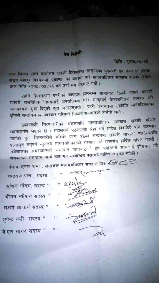 दाङ। जिल्ला प्रहरी कार्यालय दाङको हिरासतमा रहेका पुर्वमन्त्री एवं नेपाल कम्युनिष्ट पार्टीका प्रवक्ता खड्ग बहादुर विश्वकर्मा ‘प्रकाण्ड’ सँग मानवअधिकार सञ्जाल दाङको टोलीले भेटघाट गरेको छ । भेटघाटको क्रममा टोलीले प्रकाण्ड सँग हिरासत बसाईको अवस्था बारेमा जानकारी लिएको थियो । सो क्रममा नेता खड्काले राज्यले गैरन्यायिक तरिकाले आफुमाथि मुद्धा चलाईरहेको बताएका थिए । हिरासत बसाईका क्रममा मानवअधिकार विपरित प्रहरीले व्यवहार नगरेको जानकारी दिँदै उनले राज्यले आफुमाथि राजनैतिक प्रतिशोध साँध्न खोजेको दाबी गरेका थिए । भेटघाट पछि विज्ञप्ती जारी गर्दै सञ्जालले प्रकाण्डको श्रँखलाबद्ध गिरफतारीप्रति गम्भिर ध्यानाकर्षण भएको जनाएको छ । अदालतले पटकपटक रिहा गर्न आदेश दिँदादिदै पनि बारम्बार प्रकाण्डलाई पक्राउ गर्दा राज्यले आफना नागरिकप्रति प्रत्याभुत गर्नुपर्ने मानवअधिकारको सम्मान गर्न पनि विज्ञप्तीमा आग्रह गरिएको छ । यस्तै वार्ताबाट समस्याको समाधान खोज्न पनि सम्बन्धित सबै पक्षलाई सञ्जालले आग्रह गरेको छ । प्रहरी हिरासतमा प्रकाण्डको मानवअधिकारका दृष्टिले सन्तोषजनक व्यवहार गरिएको निष्कर्ष आफुहरुको रहेको सञ्जालका जिल्ला संयोजक केशव कुमार शर्माले बताए । भेटघाट टोलीमा संयोजक शर्मा सँगै , सञ्जालका सदस्यहरु चन्द्रराजत पन्त , सुशिल गौतम,श्रीमन न्यौपाने, भुपेन्द्र वली र जे.एन सागरको सहभागिता रहेको थियो । निर्वाचनका क्रममा तत्कालिन प्रधानमन्त्री शेर बहादुर देउवा तुलसीपुर आएको बेला बम विष्फोट गराएको मुद्धा चलाएर शुक्रबार साँझ नेता विश्वकर्मालाई दाङ ल्याईएको हो । अदालतले विश्वकर्मालाई रिहाई गर्न पटकपटक आदेश दिएतापनि प्रहरीले पाँचौ पटक उनलाई गिरफतार गरि दाङबाट मुद्धा चलाएको छ । [gallery link=\"file\" columns=\"1\" size=\"full\" ids=\"205162\"]