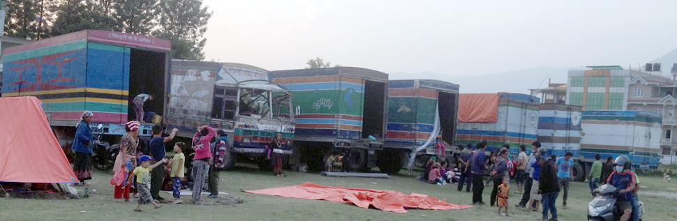 ठूलठूला गाडी । बाहिरबाट हेर्दा ट्रकजस्ता लाग्ने । भित्र हेर्दा संरचना फरक । चालकदलका निम्ति अगाडिपट्टि छुट्टै क्याबिन । पछाडिपट्टिको मूल भाग पूरै खाली । दायाँबायाँ र माथिपट्टि च्यासिस र बडीले पूरै मोडिएका । पछाडिपट्टिका ढोका ह्वाङ्गै खुला । ‘मालबाहक कन्टेनर’ भनिने यी गाडीलाई सधैं भ्याईनभ्याई हुन्थ्यो तातोपानीदेखि काठमाडौंसम्म सामान ओसार्न । पूरै बदलिदिएको छ मालबाहक कन्टेनरको भूमिकालाई वैशाख २९ को दोस्रो भूकम्पले । भूकम्पले बेघरबार बनाइदिएका तातोपानीवासीका निम्ति ‘घर’ बन्न पुगेका छन् यतिबेला यी कन्टेनरहरु । राजधानीको थलीस्थित कान्तिभैरव माध्यमिक विद्यालय अगाडि रहेको ठूलो चौरमा ‘घर’ बनाइरहेका छन् यस्ता ११ वटा कन्टेनर र अरु ३ वटा स–साना गाडीलाई तातोपानीवासीले यतिबेला । [caption id=\"attachment_20670\" align=\"alignleft\" width=\"371\"]\"IMG_5499\" संयोजक कार्साङ र सहसंयोजक दावा[/caption] वैशाख १२ को महाभूकम्पले थिलथिलो पारेको तातोपानी बजारलाई २९ गतेको भूकम्पले पूरै पहिरोमा बदलिदिएपछि त्यहाँबाट विस्थापित ४७ परिवार जेठ १ गते राति तिनै कन्टेनरमा चढेर राजधानीस्थित थलीको खुला चौरमा आए । परिवारका सबै एउटै कन्टेनरमा चढ्दा बीचबाटोमै पहिरोले पुरिएर पूरै परिवार सखाप होला भन्ने त्रासका कारण बाँडिएर भिन्नाभिन्नै कन्टेनर चढी राजधानी आएकाे बताउँछन् उनीहरु । बालबालिका, वृद्धवृद्धा, सुत्केरी र गर्भवतीलाई प्राथमिकतापूर्वक कन्टेनरभित्र बस्ने व्यवस्था मिलाएर उनीहरुमध्ये आजा जसो चउरमै पाल हालेर दिनरात गुजारिरहेका छन् । ४७ परिवारका १ सय ९० नागरिक तातोपानी– ४, नयाँवस्तीबाट विस्थापित भई थली चौरमा आइपुगेका छन् । यीमध्ये ४ जना गर्भवती, ३ जना भर्खरैका सुत्केरी र ११ जना ६० वर्ष नाघिसकेका वृद्धवृद्धा भएको जानकारी गराए उनीहरुको व्यवस्थापनका निम्ति गठित ७ सदस्यीय कमिटीका सहसंयोजक दावा तामाङले । थली चौरमा आश्रितहरुको सम्पूर्ण तथ्यांक संकलित खाता नै देखाएर सहसंयोजक तामाङले जानकारी दिए– ‘अहिले यहाँ जिरेलका १, पौडेलका १, घलेका १, तिमल्सिनाका १ परिवार र बाँकी सबै तामाङ र शेर्पाका परिवार छन् ।’ विभिन्न दाताले उपलब्ध गराउने राहतको समानतापूर्ण वितरण गर्ने, अशक्त, बालबालिका र वृद्धवृद्धाको हेरचाह गर्ने र सरकारसँग यथासिघ्र पुनर्वासको व्यवस्था गर्न माग गर्ने उद्देश्यका साथ उनीहरुले कार्साङ लामाको संयोजकत्वमा ७ सदस्यीय कमिटी नै गठन गरेका रहेछन् । दावा तामाङ सहसंयोजक रहेको उक्त कमिटीमा पेम्बा तामाङ, कमिनी तामाङ, काली शेर्पिनी, मिङमा शेर्पा र कुमार शेर्पा सदस्य छन् । वैशाख २९ को भूकम्पले तातोपानीको नयाँवस्तीका ३ जना र व्यापार तथा घुमफिरका लागि तातोपानी आएका सयौं अपरिचितको घटनास्थलमै ज्यान लिएको बता