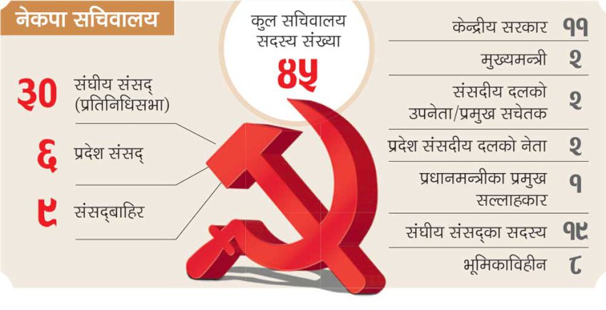 जिम्मेवारी तय नहुँदा सरकारमा रहेका नेता सरकारमै र केन्द्र तथा प्रदेश संसद्मा रहेका संसदीय भूमिकामै सिमित छन् । यी दुवै जिम्मेवारीमा नरहेका नेताहरू भने फूर्सदिला छन् । स्थायी कमिटीमा रहेका ४५ मध्ये ३० जना संघीय संसद्, ६ जना प्रदेश संसद् र ९ जना संसद् बाहिर छन् । तीमध्ये ११ जना ओली नेतृत्वको सरकारमा सहभागी छन् । २ जना मुख्यमन्त्री (गण्डकी र कर्णाली प्रदेश), २ जना प्रतिनिधिसभातर्फ संसदीय दलको उपनेता र प्रमुख सचेतक, २ जना प्रदेश संसदीय दलको नेता र १ जना प्रधानमन्त्रीका प्रमुख सल्लाहकार छन् ।