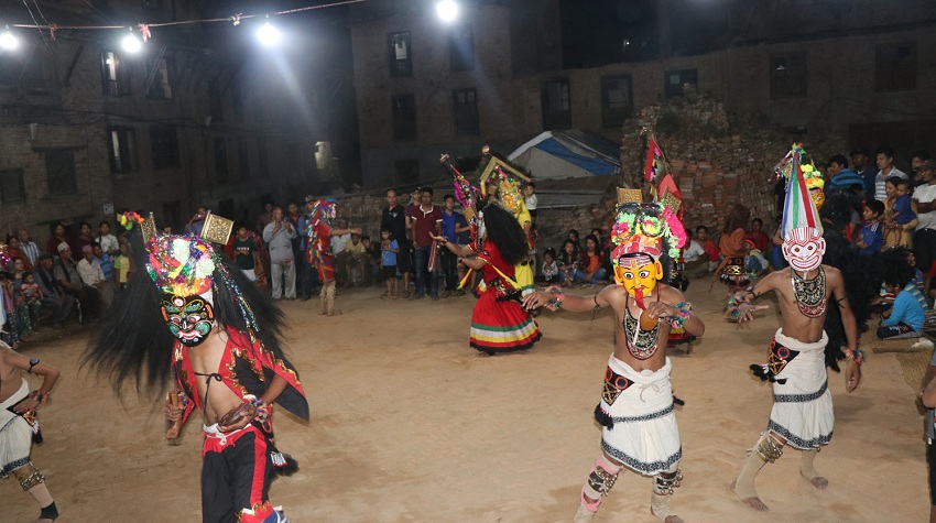 रमेश गिरी । भक्तपुर, १२ असोज । साँझ ढल्किँदै जान्छ, रात पर्दै जान्छ । रातको अँध्यारामा घरघर र टोलटोलमा बलेका बिजुली बत्तीको उज्यालो छिचोल्दै महाकाली, देवी, भूत भैरव, ख्यां, कवांलगायत विभिन्न देवीदेवता निस्कन्छन् ।