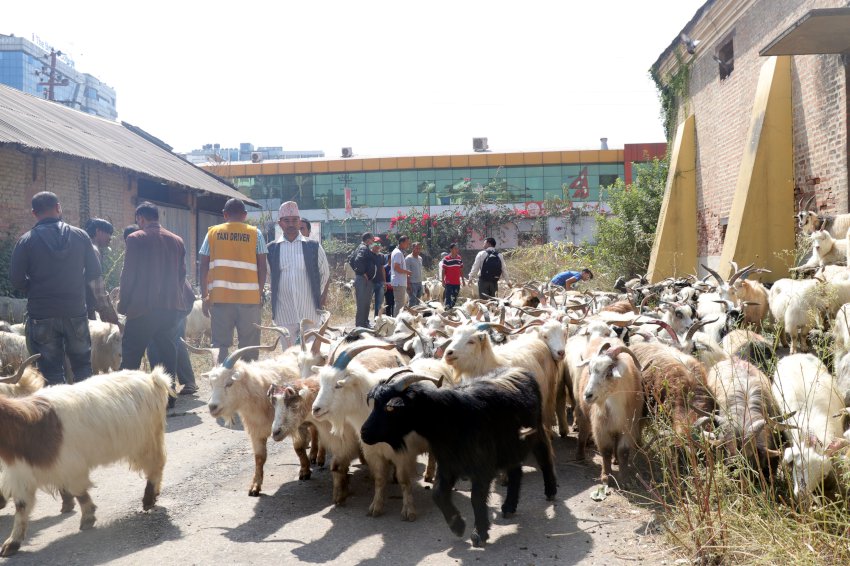 काठमाडाैं । काठमाडौंको थापाथलीस्थित खाद्य संस्थानको गोदाममा दशैँका लागि बिक्रीमा राखिएका च्याङ्ग्रा । यहाँ च्याङ्ग्रा प्रति केजी रु ७१० मा बिक्री भइरहेको छ । तस्वीरः रासस \"\"