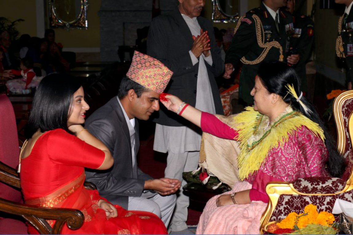 त्यसअघि राष्ट्रपतिले दीप, कलश र गणेशको पूजा गरेकी थिइन् । राष्ट्रपति भवनको प्रेक्षालयमा टीका मङ्गलटीकाको कार्यक्रम भइरहँदा नेपाली सेनाको एक टोलीले मन्द तर मधुर ध्वनिमा मङ्गलधुन बजाइएको थियो ।