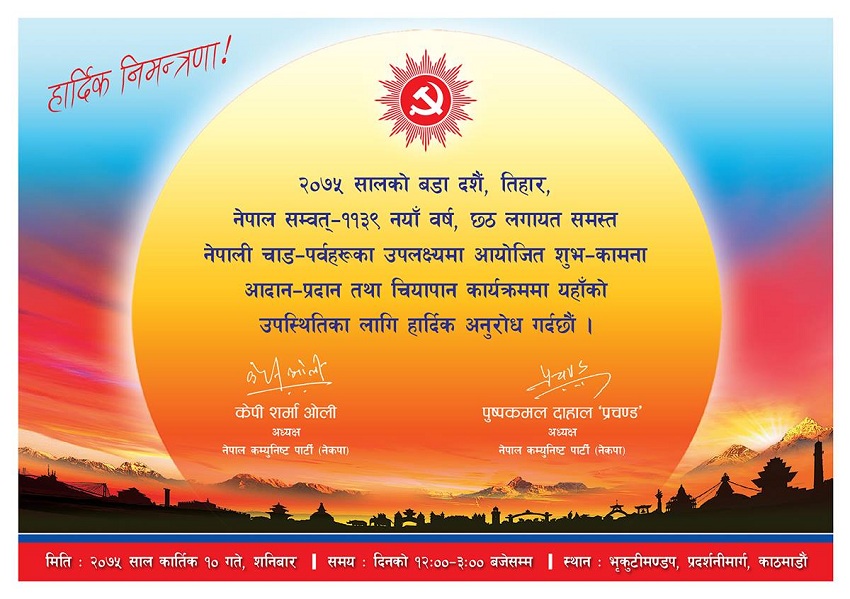 पार्टी एकतापछि पहिलो पटक विजया दशमी, दीपावली, नेपाल सम्वत् र छठका अवसरमा गर्न थालेको चियापान कार्यक्रममा झण्डै ५० हजार व्यक्तिलाई निम्ता गरिएको नेकपाले जनाएको छ ।