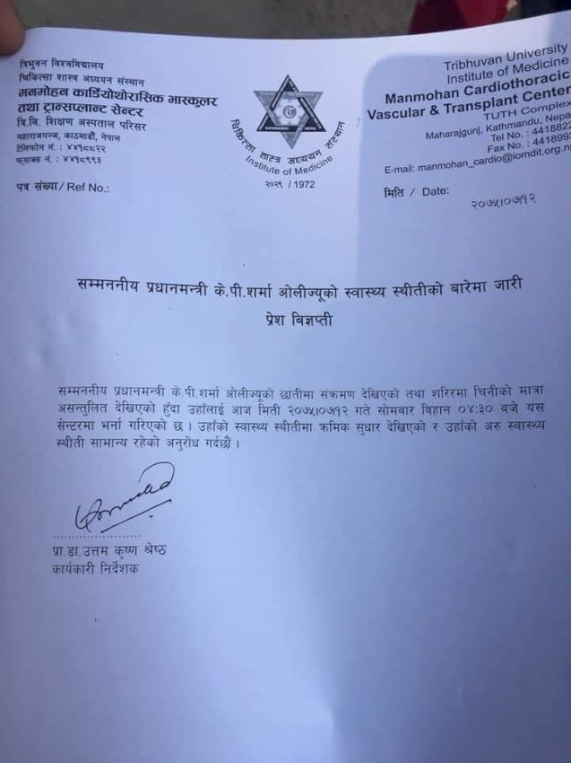 प्रधानमन्त्रीको स्वास्थ्य अवस्थाबारे अस्पतालले निकाल्यो यस्तो विज्ञप्ति