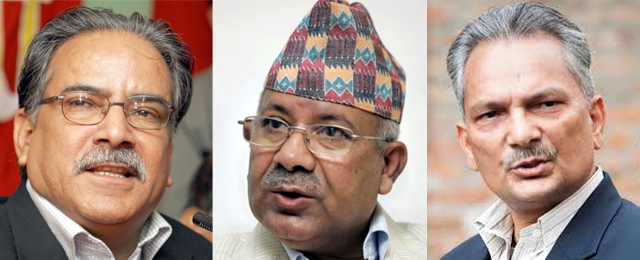 काठमाडौं, राष्ट्रिय सरकारको बहसले राजनीतिक बजार तातिइरहँदा नेपाली राजनीतिक तीन शीर्ष नेताबीच गोप्य भेटवार्ता भएको छ । एकीकृत नेकपा (माओवादी) का अध्यक्ष पुष्पकमल दाहाल ‘प्रचण्ड’, नेता बाबुराम भट्टराई र एमाले नेता माधवकुमार नेपालबीच यस्तो भेटघाट भएको हो । स्रोतका अनुसार बुधबार बिहान प्रचण्डनिवास लाजिम्पाटमा तीन नेताबीच झन्डै १ घन्टा भेटवार्ता चलेको थियो । भेटवार्ता राष्ट्रिय सरकारको विषयमा केन्द्रित भएको बताइएको छ । बुधबार बिहानको भेटवार्ताबारे विस्तृत जानकारीका निम्ति लाजिम्पाटमा खबरडबलीले सम्पर्क गर्दा समसामयिक विषयमा छलफल भएको तर भेटघाट ‘गोप्य’ नभएको बताइयो । यस्ता छलफलहरु नियमित रुपमा हुने गरेकाले यस भेटलाई पनि \'विशेष छलफल\' ठान्नु नपर्ने प्रचण्डको सचिवालयले बतायो । एमालेका वरिष्ठ नेता माधवकुमार नेपाल र एमाओवादीका वरिष्ठ नेता बाबुराम भट्टराईले महाभूकम्पलगत्तैदेखि राष्ट्रिय सरकारको गठनमा जोड दिँदै आइरहेको र एमाओवादी अध्यक्ष प्रचण्डले नयाँ संविधानका अन्तर्वस्तुमा सहमतिविना सरकारको प्रश्नमा छलफलै अावश्यक नरहेकाे धारणा राख्दै आएकाले माधव–बाबुरामले आपसमा सल्लाह नै गरेर राष्ट्रिय सरकारको पक्षमा प्रचण्डलाई ‘कन्भिन्स’ गर्ने प्रयासका रुपमा बुधबारको छलफल आयोजना गरिएको समाचार स्रोतले दावी गरेकाे छ । राष्ट्रिय सरकार निर्माणका सम्बन्धमा सबै पार्टीका बीचमा मतैक्यता भए पनि एकीकृत नेकपा (माओवादी) का अध्यक्ष प्रचण्डले भने संविधानका अन्तर्वस्तुमा सहमति नभर्इ सरकारको बहसमा आफूहरु सामेल हुनु सम्भव नभएको बताइरहेका बेला तीन नेताबीच भएको यो भेटघाटले महत्वपूर्ण अर्थ राख्ने जानिफकारहरू बताउँछन् ।