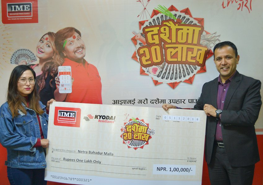 काठमाडौं ।नेपालको नेतृत्वदायी रेमिटेन्स सेवा प्रदायक कम्पनी आइएमईले २०७५ सालमा मनाइने पर्वहरू जस्तैः– दशैं, दीपावली र छठलाई लक्षितगर्दै ल्याएका ेसेवाग्राही मूखि प्रवद्र्धनात्मक कार्यक्रम‘दशैंमा बिस लाख’योजना अन्तर्गत पहिलो महिनाकाे विजेता घोषणा गरेको छ ।क् योदाइ रेमिटेन्स जापानबाट नेपालमा आइएमई गर्ने आइएमई सेवाग्राही श्री नेत्र बहादुर मल्ल सफ्टवेयर पद्वतीमा आधारित ‘लक्की ड्र’ बाट पहिलो महिनाको विजेता घोषित भएका छन् ।