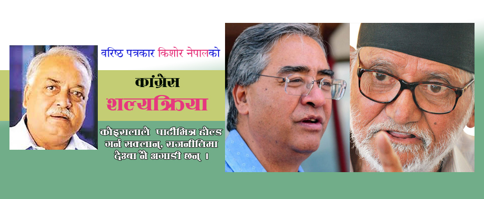 नेपालको राजनीतिमा राष्ट्रिय सरकारको बहस उठिरहेका बेला वरिष्ठ पत्रकार किशोर नेपालसँग शीर्ष नेताहरुको राजनीतिक चरित्रका बारेमा कुरा गर्न खबरडबलीका आरपी सापकोटासुदीप विश्वकर्मा उनको निवास पुगेका थिए। हक्की स्वभावका नेपालले राजनीतिक दलका नेताहरु र नेपाली राजनीतिलाई नजिकबाट छामेका छन् । ३ ठूला पार्टीका ६ शीर्ष नेताका बारेमा पत्रकार नेपालले खुलेर कुरा गरे । करिव ३ घन्टा लामो कुराकानीको सोही श्रृखंलालाई हामीले ३ अंकमा प्रस्तुत गर्दै छौं । प्रस्तुत छ, किशोर नेपालको कांग्रेस–शल्यक्रिया –सम्पादक ।