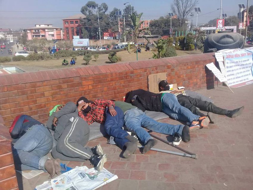 काठमाडौं। आफुहरुको निःशुल्क उपचारको व्यवस्था गरिदिन सरकारसंग माग गर्दै काठमाडौंको माईतिघर मण्डलामा ४ दिनदेखि अनशन बसिरहेका जनयुद्ध तथा जनआन्दोलनका क्रममा घाईते भएकाहरुको स्वास्थ्य अवस्था नाजुक बन्दै गएको छ । अनशन बसेका ६ जनामध्ये मकवानपुरका मंगल सिंह प्रजा र बर्दियाका तिलाचन्द्र कामी बेहोश भएका छन् । बेहोश भएका प्रजा र कामीको उपचारमा कसैले पनि वास्ता नगरेको अनशनरत कालीकोटका संग्राम कामीले जानकारी दिए । चिसो र भोकले कठ्याङ्ग्रीएर प्रजा र कामी बेहोश भएका हुन् । ‘गणतन्त्रका लागी आफुहरुले शरिरका अंग गुमायौं, कामीले भने , अहिले हामी उपचारका लागी सडकमा भिख माग्नु परिरहेको छ । गणतान्त्रिक कम्युनिष्ट सरकारले पनि सहयोग गर्दैनन् ।’ गिरफ्तार गरिएका घाईते अपांग संघर्ष समितिका संयोजक युवराज बिकलाई तत्काल रिहा गर्नुपर्ने , घाईते अपांगलाई गणतन्त्र योद्धा घोषणा गरि परिचयपत्रको व्यवस्था गरिनुपर्ने , रोजगारीको व्यवस्था गरिनुपर्ने , घाईते अपांगका छोराछोरीलाई निशुल्क पढाईको व्यवस्था गरिनुपर्ने माग राख्दै उनीहरु अनशन बसेका हुन् । अपांग समितिका संयोजक बिकलाई झुट्ठा मुद्धा लगाई प्रहरीले महानगरिय प्रहरी परिसर ,जाउलाखेल ललितपुरको हिरासतमा राखिएको आन्दोलनहरुको आरोप छ ।