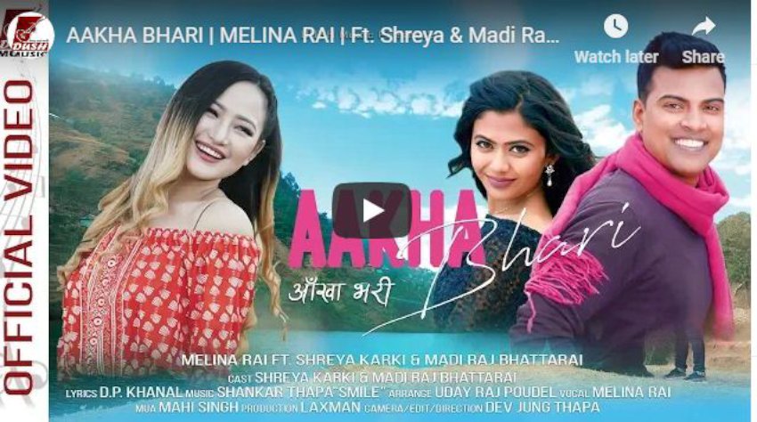काठमाडौं । चर्चित गायिका मेलिना राईको आवाजमा रहेको नयाँ गीत \'आँखा भरी\' को म्युजिक भिडियो हालै सार्बजनिक भएको छ। गीतकार डि.पी. खनालको रचना रहेको गीतमा शंकर थापा स्माईलको संगीत साथै उदयराज पौडेलको संगीत संयोजन रहेको छ। कलाकारर मोडेल श्रेया कार्की र नब प्रबेशी मोडेलस् मणी राज भट्टराई को अभिनय रहेको भिडियोका ड्रन पाईलट मेघराज मग्राती हुन् भने छांयाकंन, सम्पादन र निर्देशन देबजंग थापाले गरेका छन् । गीतको अडियो भिडियोलाई डस म्युजिक नेपाल ले प्रस्तुत गरेको छ। हेर्नुस् भिडियोस्