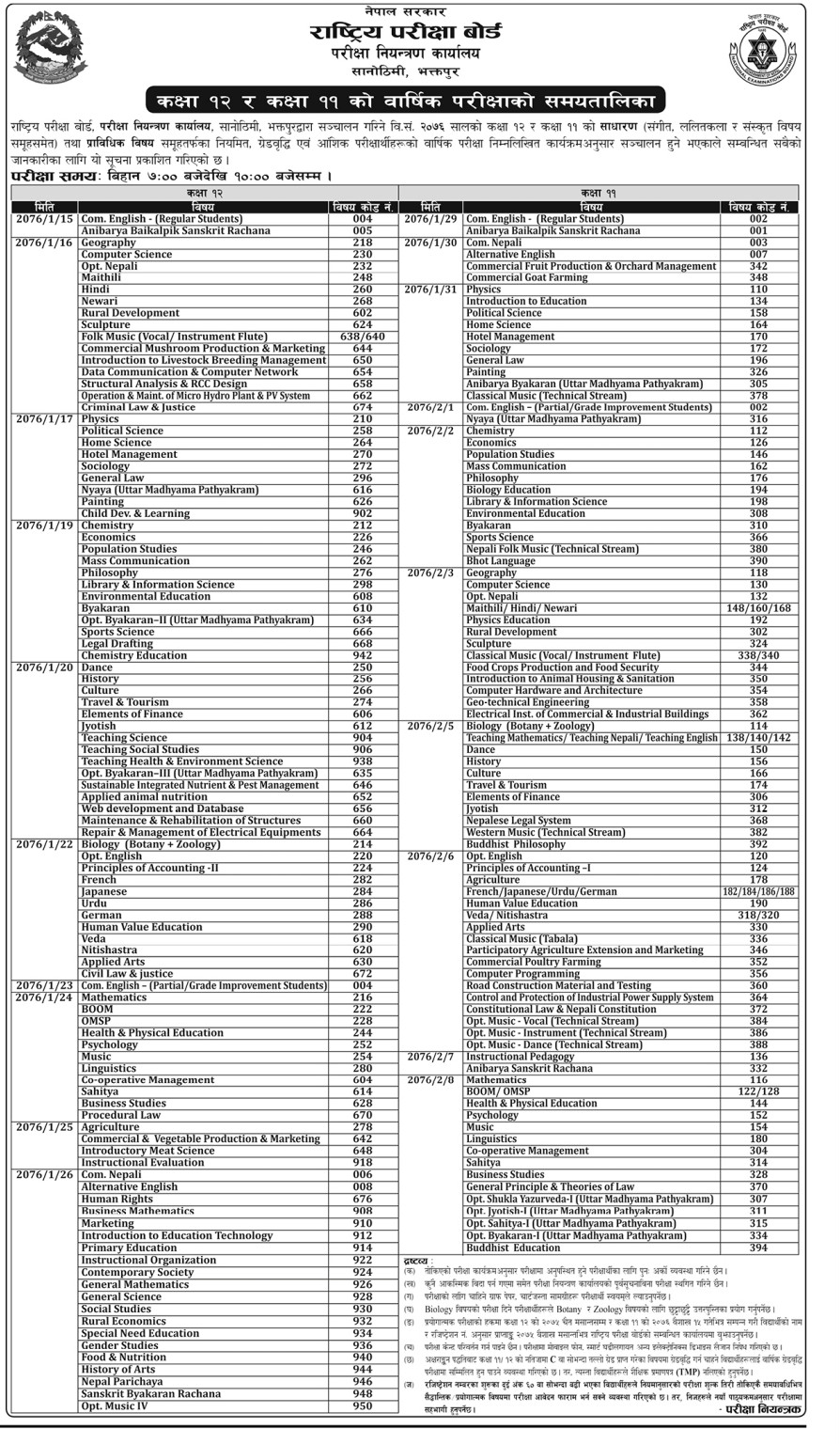 कक्षा ११ र १२ को परीक्षा तालिका सार्वजनिक (हेर्नुहोस् तालिका)