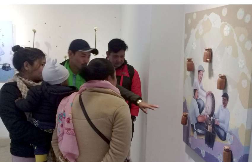 नजिकै सन्तोष राईका चित्र सङ्गालो छ । उनले चुलोको ‘इन्स्टलेसन आर्ट’ निर्माण गरेर संस्कृति संस्कार परिवर्तन भइरहन्छन्, यो व्यावसायिक पनि भइरहनुपर्छ भन्ने सन्देश दिँदै चित्र कोरेका छन् ।