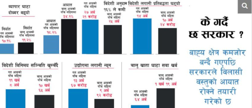 -खासगरी बाह्य क्षेत्र कमजोर हुँदै गएपछि सरकार केही अत्तालिएको देखिएको छ, जसका कारण विदेशबाट नेपालीले ल्याउने रक्सी, सुनचाँदी र गरगहना, मोबाइललगायत विद्युतीय सामग्रीलगायतमा समेत कडाइ गर्न थालेको छ । बाह्य क्षेत्र असन्तुलन बढ्दै गएपछि सरकारले विदेशी लगानी तथा ऋण भित्र्याउन विशेष पहल गरिरहेको छ । आगामी मार्चमा सरकारले लगानी सम्मेलन गर्दै छ । त्यस्तै, केन्द्रीय बैंकले बैंक तथा वित्तीय संस्थामार्फत विदेशी ऋण भित्र्याउन समेत जोड दिइरहेको छ ।