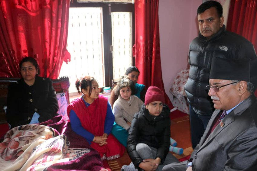 बुधबार ताप्लेजुङमा हेलिकप्टर दुर्घटना भई मृत्यु भएका अधिकारीको निवासमा उनका बाबा, आमालाई हिजै पोखराबाट काठमाडौं ल्याइएको थियो । प्रचण्डले बिहिबार विहान अधिकारी परिवारलाई भेटी समबेदना दिउका हुन् ।