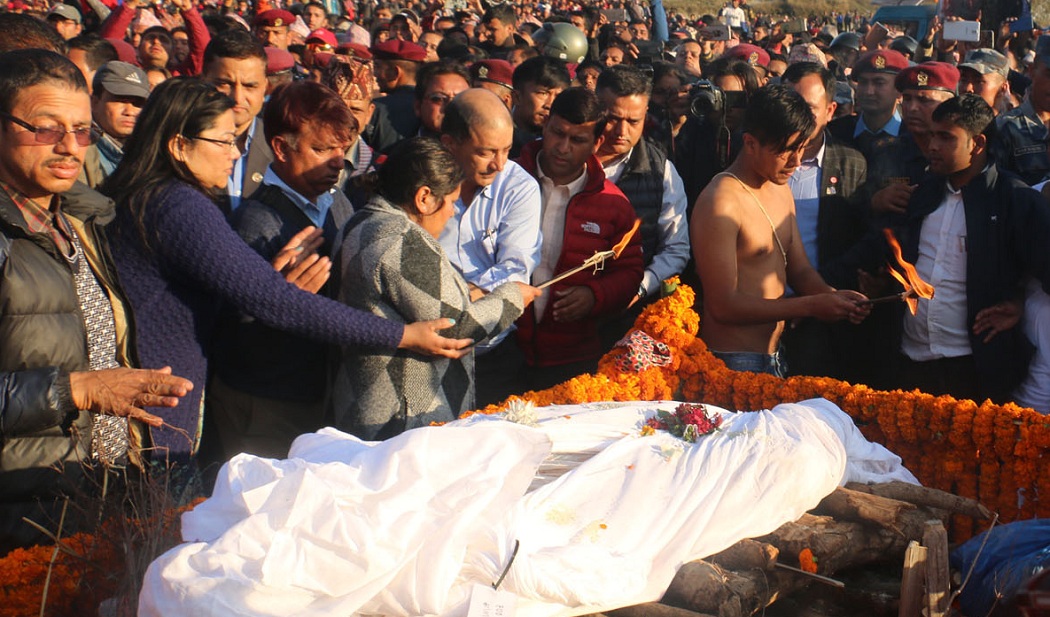 पोखरा । ताप्लेजुङमा हेलिकप्टर दुर्घटनामा निधन भएका संस्कृति, पर्यटन तथा नागरिक उड्ययनमन्त्री रवीन्द्र अधिकारीको राजकीय सम्मानका साथ आज पोखराको रामघाटमा अन्त्येष्टि गरिएको छ । रामघाटमा उहाँको पार्थिव शरीरमा श्रीमती विद्या भट्टराई, छोराहरु विराज र स्वराज अधिकारीले दागवत्ति दिए । त्यसअघि अधिकारीको पार्थिव शरीर अन्तिम श्रद्धाञ्जलीका लागि पोखराकै नयाँबजारस्थित प्रदर्शनी केन्द्रमा राखिएको थियो । श्रद्धाञ्जलिपछि पोखराका विभिन्न भागको परिक्रमा गरी दाहसंस्कारका लागि उहाँको पार्थिव शरीरलाई रामघाट पुर्याइएको हो ।