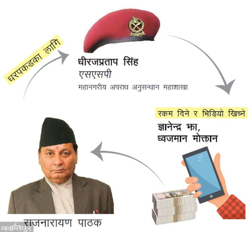 काठमाडौ । अख्तियार दुरुपयोग अनुसन्धान आयोगका तत्कालीन आयुक्त राजनारायण पाठकको घूस प्रकरणमा महानगरीय अपराध अनुसन्धान महाशाखा प्रमुख एसएसपी धीरजप्रताप सिंहको नामसमेत जोडिएको छ । आफूले घूस लिएको स्विकारेको भिडियो खिचिएको थाहा पाएपछि पाठकले महाशाखा प्रमुख सिंहलाई प्रयोग गरेर भिडियो खिच्ने ज्ञानेन्द्र झा र ध्वजमान मोक्तानलाई धरपकड र पक्राउ गरेको खुलेको छ ।