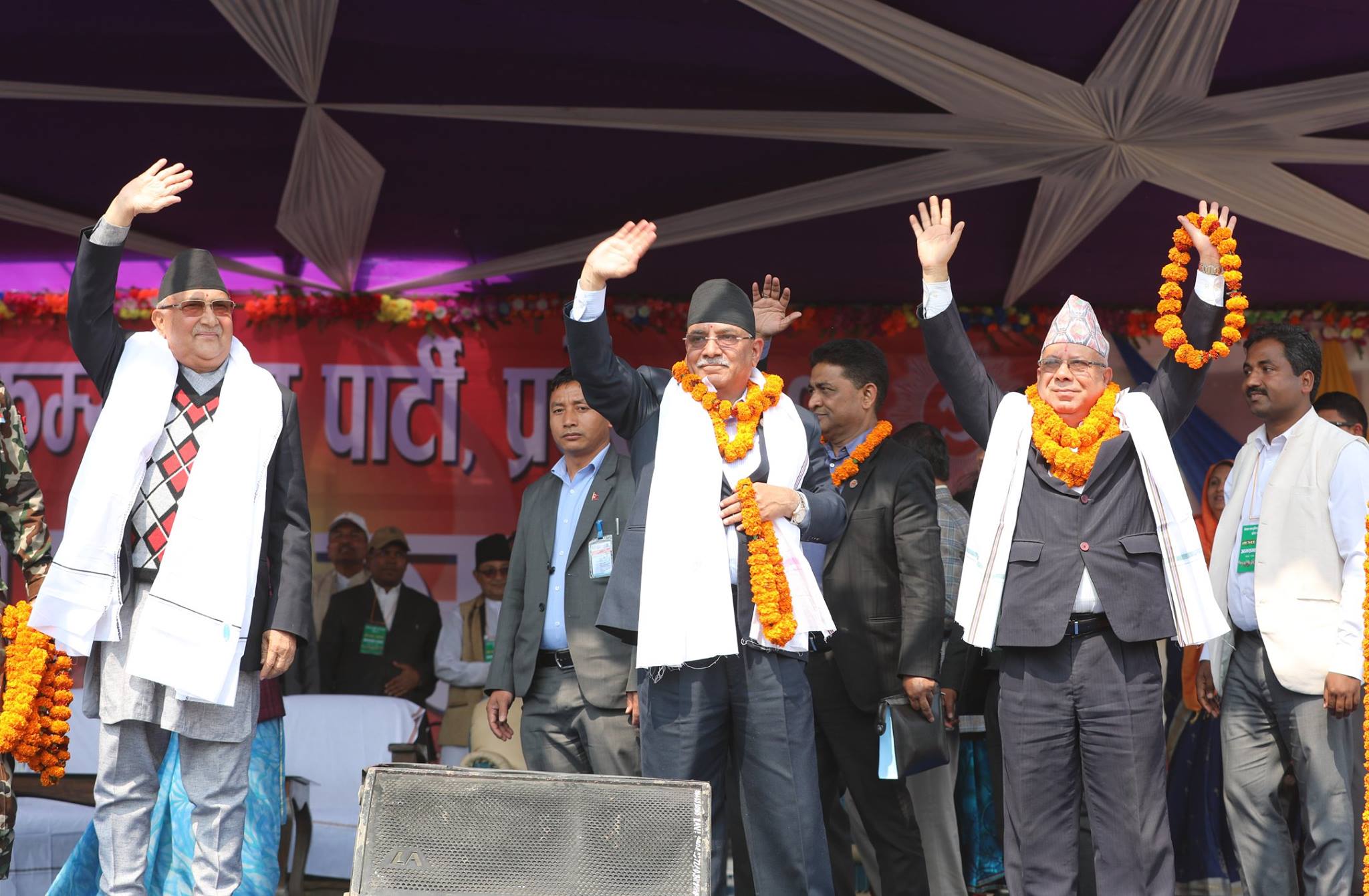 अध्यक्ष प्रचण्डले प्रधानमन्त्रीकै पहलमा सीके राउतसँग सहमति भएको जानकारी गराए । यस्तै पूर्वप्रधानमन्त्री माधवकुमार नेपालले दुई पार्टी मिलेर बनेको नेकपालाई टक्कर दिने कुनै पार्टी नभएको दाबी गर्नु भयो । देश बचाउने पार्टी नेकपा भएको उल्लेख गर्दै उनले मधेस केन्द्रित दलको भ्रमममा नपर्न आग्रह गरे ।