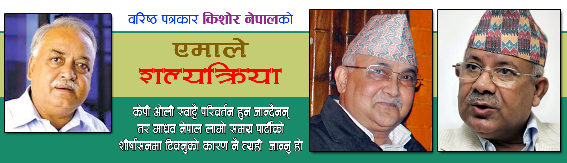 \"Kishor_Nepal_Breaking\"नेपालको राजनीतिमा राष्ट्रिय सरकारको बहस उठिरहेका बेला वरिष्ठ पत्रकार किशोर नेपालसँग शीर्ष नेताहरुको राजनीतिक चरित्रका बारेमा कुरा गर्न खबरडबलीका आरपी सापकोटासुदीप विश्वकर्मा उनको निवास पुगेका थिए। हक्की स्वभावका नेपालले राजनीतिक दलका नेताहरु र नेपाली राजनीतिलाई नजिकबाट छामेका छन् । ३ ठूला पार्टीका ६ शीर्ष नेताका बारेमा पत्रकार नेपालले खुलेर कुरा गरे । करिव ३ घन्टा लामो कुराकानीको सोही श्रृखंलाअन्तर्गत कांग्रेस शल्यक्रिया अघिल्लो हप्ता प्रकाशित भइसकेको छ । दोस्रो अंक  प्रस्तुत छ, किशोर नेपालको एमाले–शल्यक्रिया –सम्पादक । ओलीका कुरा पूरै फलो गर्ने हो भने एमाले सबभन्दा बढी कन्जरभेटिभ पार्टी बन्छ केपी ओलीलाई म लामो समय जेल बसेको, पार्टीको एउटा प्रभावशाली व्यक्तित्व भनेर चिन्छु । त्योभन्दा बढी उनी गृहमन्त्री बेदाग निक्लिएका हुन् । ओलीले अब फेरि त्यो छवि बनाउन सक्दैनन् । \"kp-oli-640\"राजनीतिक रुपमा ओलीले धेरै मानसिक द्वन्द्वहरु खेपेका छन् पक्कै । एमालेको राजनीतिमा सधैं पछि पर्ने, तल पर्ने । माधवजीले त कुन्डली मारेर बसेको सर्पले जस्तो बाटो हेरेर बस्ने । अमृत बोहोरालगायतका एमालेका एक से एक सिपसालारहरु पनि त्यहीँ थिए । माधवजीको त्यो क्वालिटी थियो । ओली बबुरा भए त्यतिखेर । त्यही बबुरोपनबाट जोगिन तुकबन्दी गर्न थाले, टुक्का जोड्न थाले । कार्यकर्ताहरुलाई हँसाउने–रुवाउनेजस्ता कामहरु गर्न थाले । आफूलाई केन्द्रमा स्थापित गराउन यिनले अनौठो तरिका अपनाए । बिरामी भए । स्वास्थ्यले साथ दिएन । तर, भाग्यले साथ दियो र एमालेका अध्यक्ष पनि भइहाले । पछिल्लो चरणमा ओलीले जस्तो प्रकारको राजनीतिक खेती सुरु गरेका छन् र जस्तो प्रकारको खेल खेल्दैछन्, त्यसले के देखिन्छ भने उनी आंशिक परिवर्तनकारी हुन् । उनी स्वाट्टै परिवर्तन हुन जान्दैनन्, सक्दैनन् । बाँधिएका मान्छे हुन् । हुन त नेपालका सबै नेताहरु कुनै न कुनै किलोमा बाँधिएका छन् । सबैका लागि एउटा–एउटा ‘मास्टर’ होलान् ।