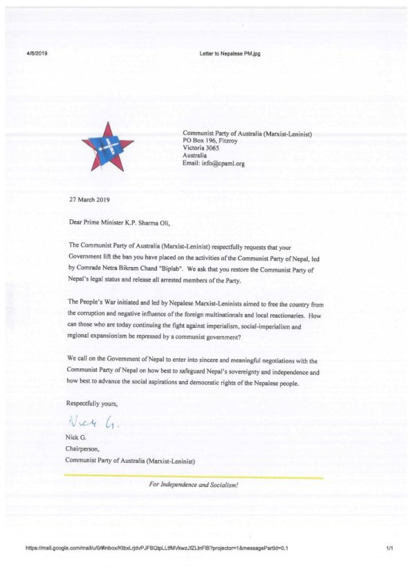 अस्ट्रेलिया कम्युनिस्ट पार्टी (माक्र्सवादी—लेनिनवादी) का अध्यक्ष निक जीले ओलीको नाममा लेखेको पत्रमा भनिएको छ, ‘हामी आदरपूर्वक अनुरोध गर्दछौं, नेत्रविक्रम चन्द विप्लवले नेतृत्व गरेको नेपाल कम्युनिस्ट पार्टीका क्रियाकलापमाथि लगाएको प्रतिवन्धलाई हटाइयोस् ।\'
