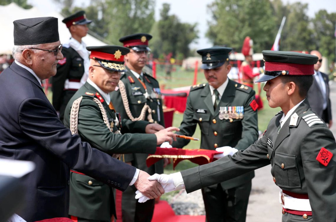 प्रधानमन्त्री ओलीले नेपाली सेनाका सिसं ५७ अधिकृत क्याडेटतर्फ नौ महिला र केन्या तथा माल्दिभ्सका दुई सहित ६६ एवं सिसं ४७ पदिक हुद्दा क्याडेटतर्फ ११ जना गरी कूल ७७ क्याडेट तालीमका आयुक्तलाई बधाई ज्ञापन गरे ।
