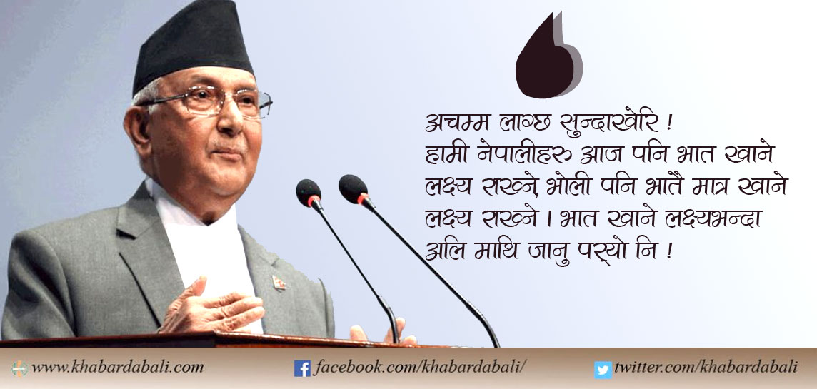 संसदमा सम्बोधन गर्दै ओलीले भने, ‘अचम्म लाग्छ सुन्दाखेरि । हामी नेपालीहरु आज पनि भात खाने लक्ष्य राख्ने, भोली पनि भातै मात्र खाने लक्ष्य राख्ने । भात खाने लक्ष्यभन्दा अलि माथि जानु पर्यो नि !\'