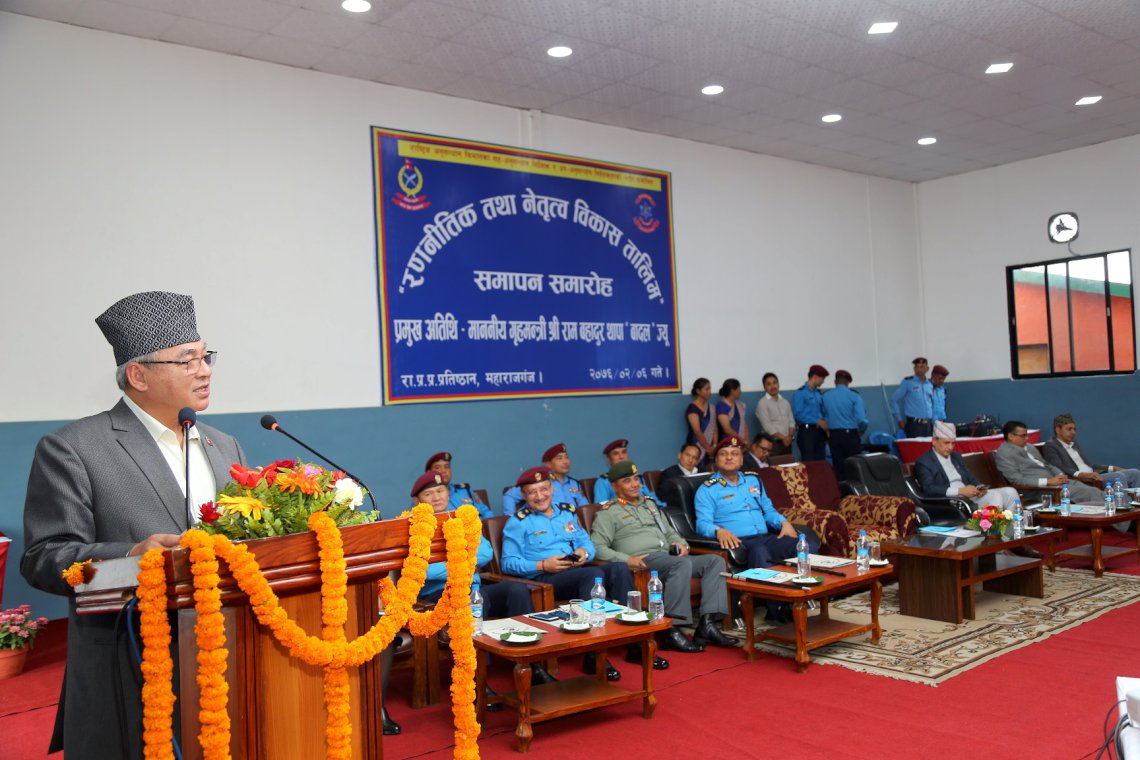 काठमाडौं । गृहमन्त्री राम बहादुर थापा ‘बादल’को प्रमुख आतिथ्यमा सोमबार राष्ट्रिय प्रहरी प्रशिक्षण प्रतिष्ठान महाराजगंजमा आयोजित एक कार्यक्रमवीच प्रथम समूहको रणनीतिक तथा नेतृत्व विकास तालिम समापन भएको छ । राष्ट्रिय अनुसन्धान विभागका सह-अनुसन्धान निर्देशक र उप-अनुसन्धान निर्देशकहरुको लागि उक्त तालिम संचालन भएको हो ।