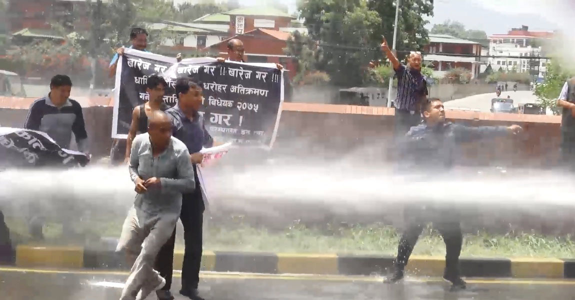 काठमाडौं । गुठी विधेयकको विरोध गर्दैै माइतीघर मण्डलामा भएको प्रदर्शनमा प्रहरीले हस्तक्षेप गरेको छ । माइघीघर मण्डलामा प्रदर्शनमा उत्रिएका सर्वसाधारणमाथि प्रहरीले पानीको फोहोरा हान्नुका साथै धरपकड गरेको हो ।