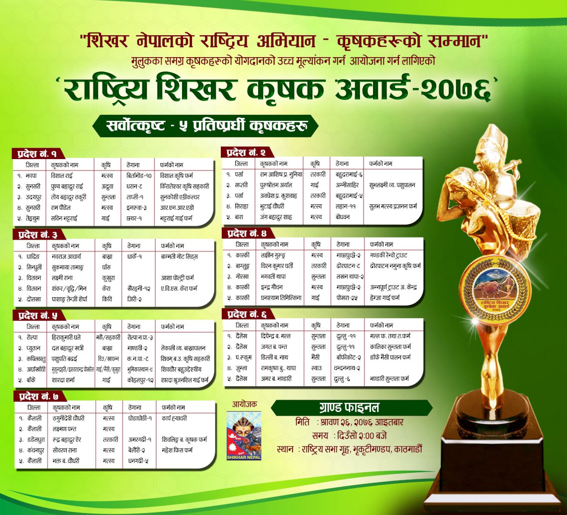 “शिखर नेपालको राष्ट्रिय अभियान – कृषकहरुको सम्मान” भन्ने नारासहित आगामी साउन २६ गते एक भव्य समारोहका विच ७ प्रदेशका ७ जनालाई “राष्ट्रिय शिखर कृषक अवार्ड–२०७६” बाट नगद पुरस्कारसहित अर्वाड प्रदान गरिने भएको हो ।