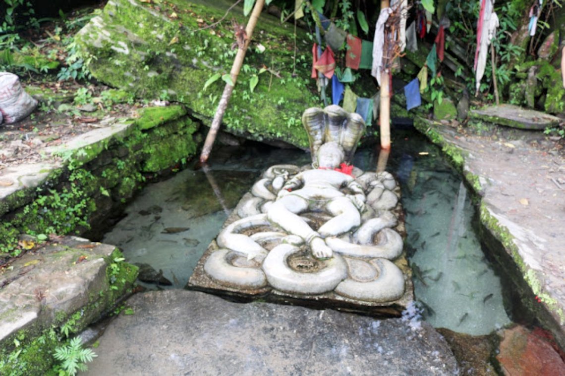 मुहानमा सात वटा सर्पमाथि किराँतेश्वरको सुतिरहेको मूर्ति छ । मूर्ति वरिपरि मान्छेको हातको औँलाभन्दा अलिक ठूलो माछा खेलिरहेको हुन्छ । माछा बस्ने कुर (बस्ने ठाउँ) छैन । बढेर ठूलोसमेत नहुने माछा कहिले उत्पादन भएको हो पत्तो छैन ।