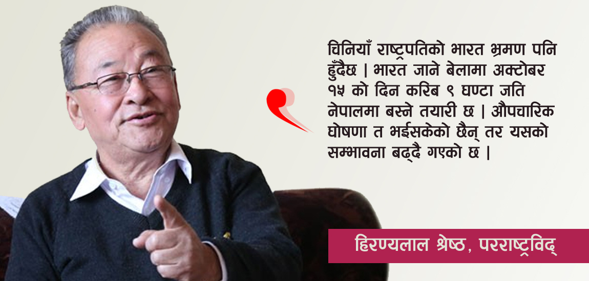 हो सम्भावना बढि छ । चिनियाँ राष्ट्रपतिको भारत भ्रमण पनि हुँदैछ । भारत जाने बेलामा अक्टोबर १५ को दिन करिब ९ घण्टा जति नेपालमा बस्ने तयारी छ । औपचारिक घोषणा त भईसकेको छैन् तर यसको सम्भावना बढ्दै गएको छ । तयारी दुवै पक्षबाट अगाडि बढाइएको छ । राष्ट्रपति सि साउथ एसियाका सबै मुलुक पुगिसके । यसपालि उनि नेपाल आउने र नेपालसँगको सम्बन्धलाई अलि माथिल्लो स्तरबाट लैजाने सोंचमा छन् । यो सन्दर्भमा उनको भ्रमणलाई साकार बनाउनका लागि नेपालले कुनै कसर बाँकी नराखी तयारी राम्रोसँग गर्नुपर्दछ ।