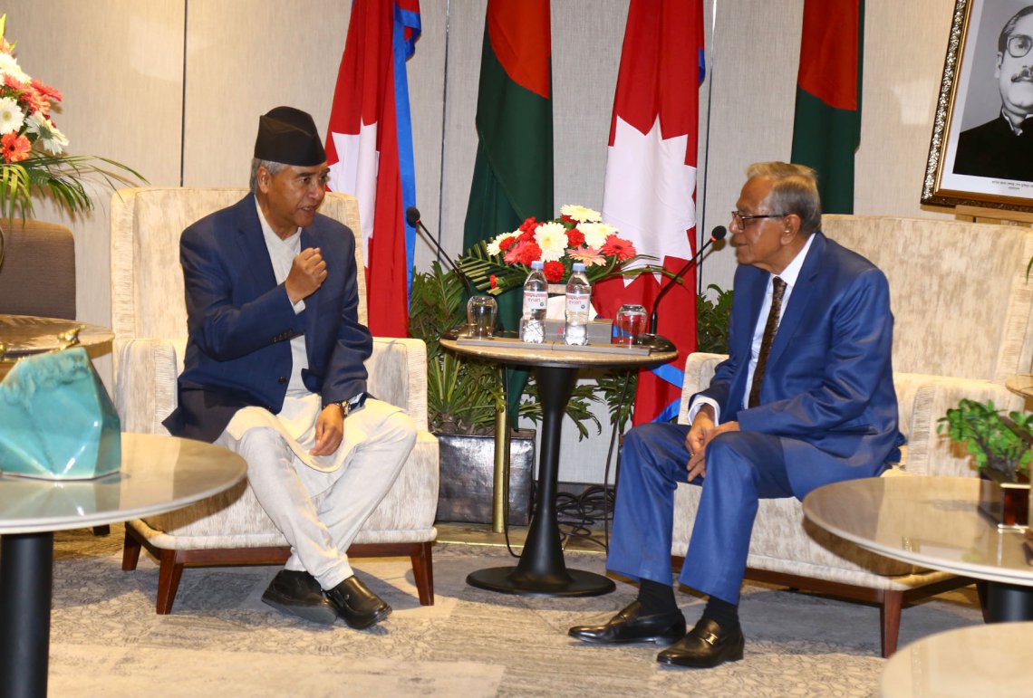काठमाडौं । नेपाल भ्रमणमा रहेका बङ्गलादेशका राष्ट्रपति मोहम्मद अब्दुल हमिदसँग नेपाली काङ्ग्रेसका सभापति शेरबहादुर देउवाले आज शिष्टाचार भेट गरेका छन्। भेटमा दुई देशबीच आपसी हित, आर्थिक साझेदारी र विकासका विषयमा समेत छलफल भएको भेटवार्तामा सहभागी काङ्ग्रेस नेता डा नारायण खड्काले जानकारी दिए ।